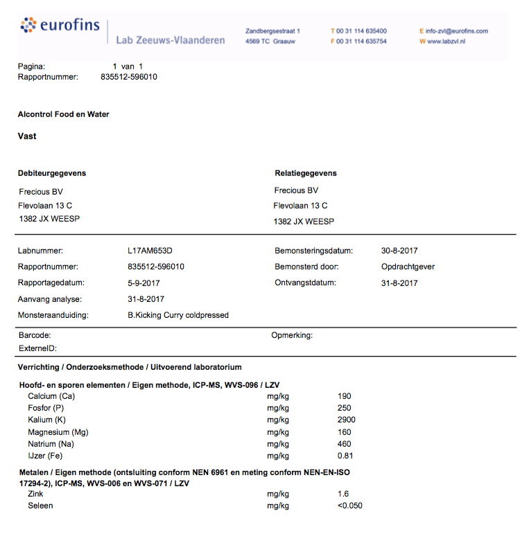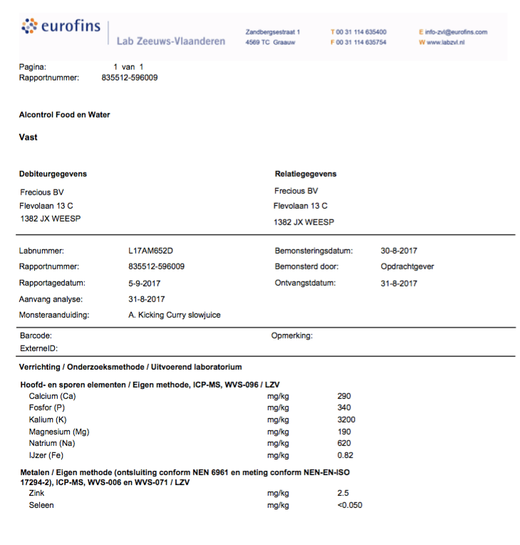 De analyses van het groentesap (de ene versie slowjuice, de andere versie cold press) is uitgevoerd op de volgende vitaminen en mineralen. De selectie hiervan is gedaan op basis van wat wij als de belangrijkste voedingsstoffen zien. De analyses zijn uitgevoerd door het laboratorium van Eurofins.