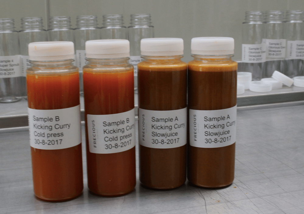 Ons doel: een hoge lichaamscelopname van vitaminen en mineralen. En dan vooral uit groenten, kruiden, specerijen, kiemen en een beetje fruit. We hebben een pilot-test gedaan en daarbij gebruik gemaakt van de verschillende ingrediënten die we in ons groentesap gebruiken. Voor een goed beeld hebben we 4 verschillende soorten groentesap getest. De Celery Slim, de Liquid Gold, de Kicking Curry en onze Glorious Green. We hebben dezelfde ingrediënten in de twee verschillende soorten juicers gedaan (we gebruikten dus cold press én slowjuice). Het sap is opgevangen in een fles en voor analyse opgestuurd.