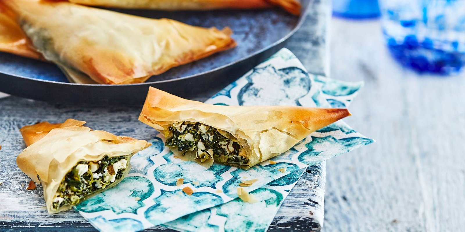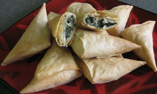 6. Nu wordt het wat lastiger, maar het is nog steeds supersimpel: neem een lepel van het spinaziemengsel en leg dat in de onderste linkerhoek van een reep. Vouw diagonaal dubbel. Vouw dit nogmaals diagonaal dubbel. Ga zo door tot je een mooi driehoekje hebt.