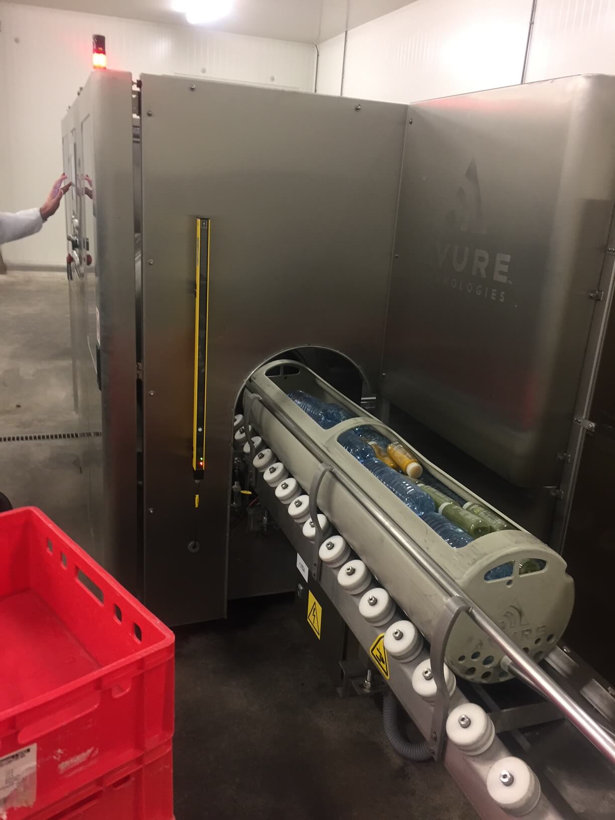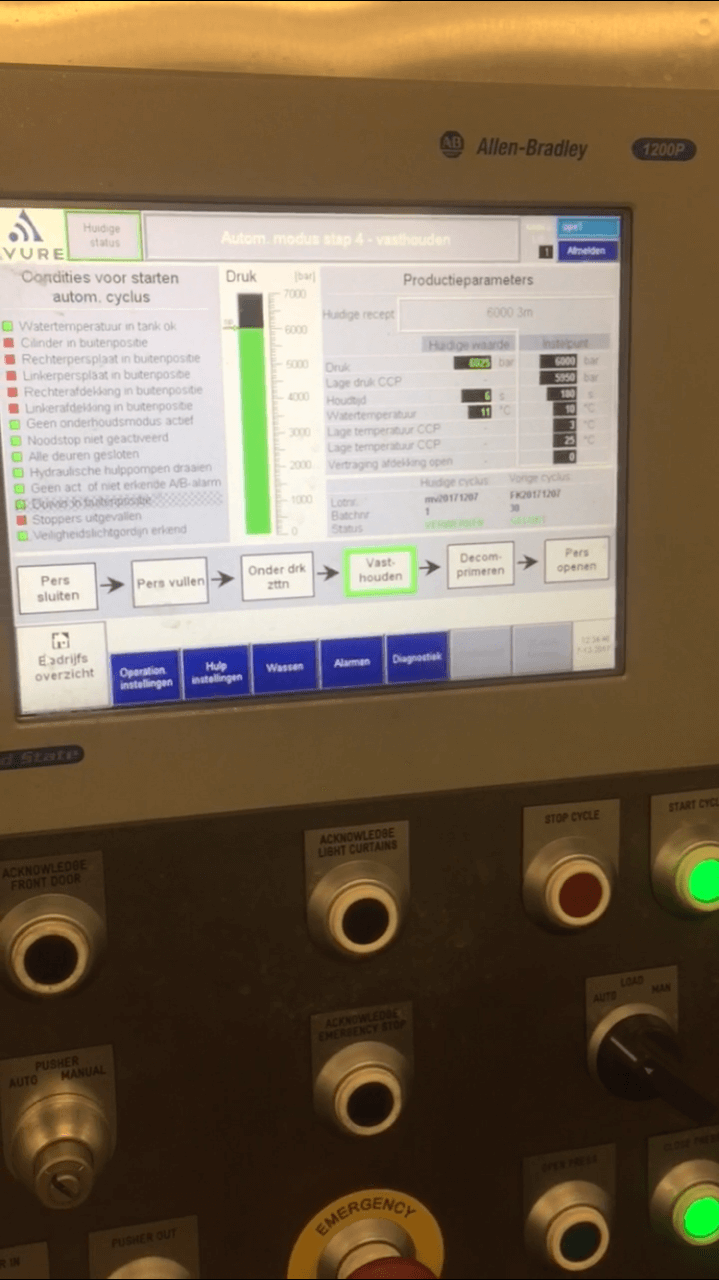 HPP is conserveren met een extreem hoge waterdruk. Met HPP zijn onze flesjes in een grote cilinder met water gegaan. De flessen komen tijdens HPP voor een paar minuten onder waterdruk van 5.000-6.000 bar te staan. Ter vergelijk, op de 11 kilometer diepe bodem van de Marianentrog in de Grote Oceaan is de waterdruk slechts 1.000 bar. HPP zorgt dus voor een enorm hoge druk.