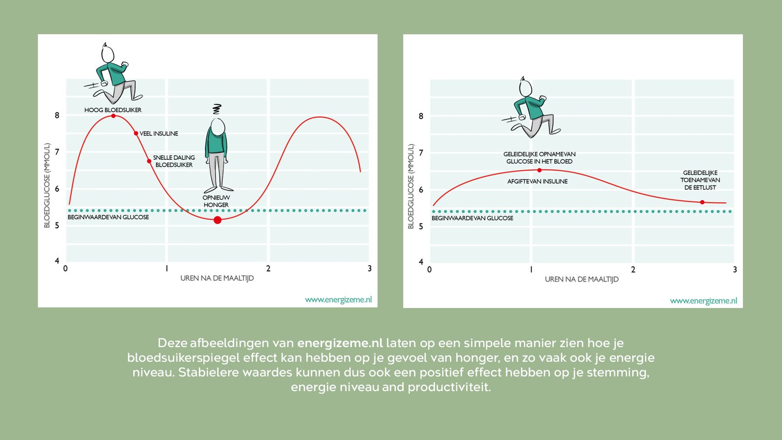Dit zou moeten voorkomen dat je bloedsuikerspiegel te snel te veel stijgt." Ook zou dit de enorme dip na die tijd moeten voorkomen.