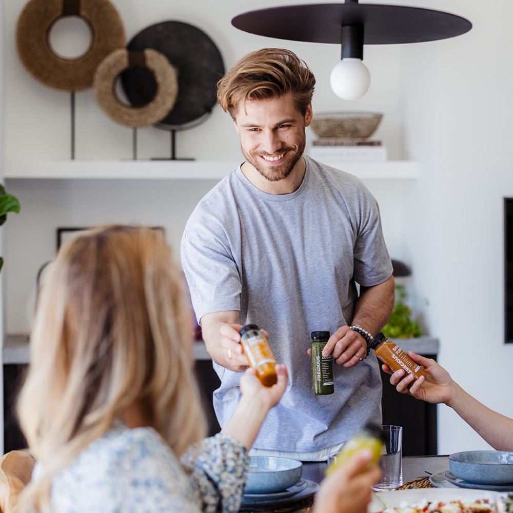 Om je lijf te helpen bij deze klus heb je voedingsstoffen nodig. Vitamine B11 (folaat) draagt bijvoorbeeld tot de vorming van rode en witte bloedcellen. En een welbekende is natuurlijk ijzer. Ijzer is goed voor een normaal zuurstoftransport, omdat het helpt bij de normale vorming van rode bloedcellen en hemoglobine. Ook vitamine B6 is van belang voor de vorming van rode bloedcellen. Mooie bronnen van deze voedingsstoffen zijn rode biet, zoete aardappel, komkommer, peer en citroen. Allemaal te vinden in dit groentesap.