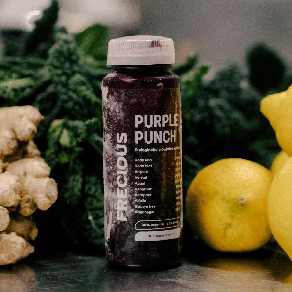 Purple Punch doet haar naam eer aan. Een diepe paarse mix van biet, blauwe bes, rode kool, wortel, gember en een verrassende twist met rabarber. De kruidnagel en alfalfa geven dit groentesap karakter. Een harmonieuze combinatie van smaken die al je smaakpapillen prikkelen.